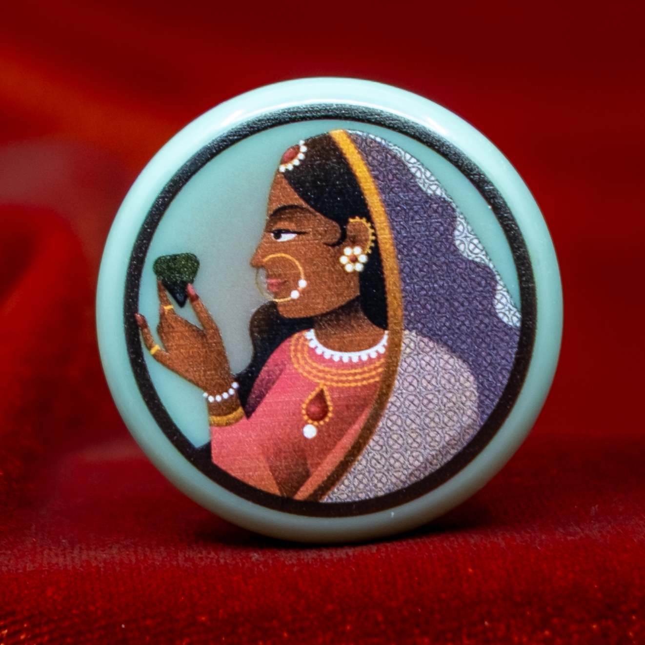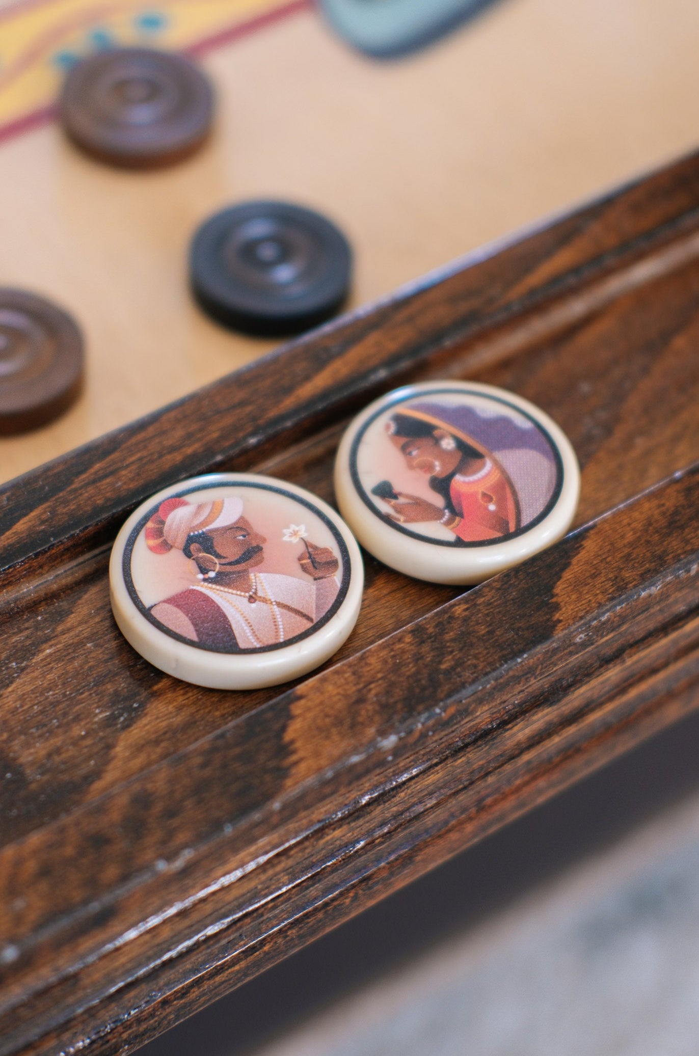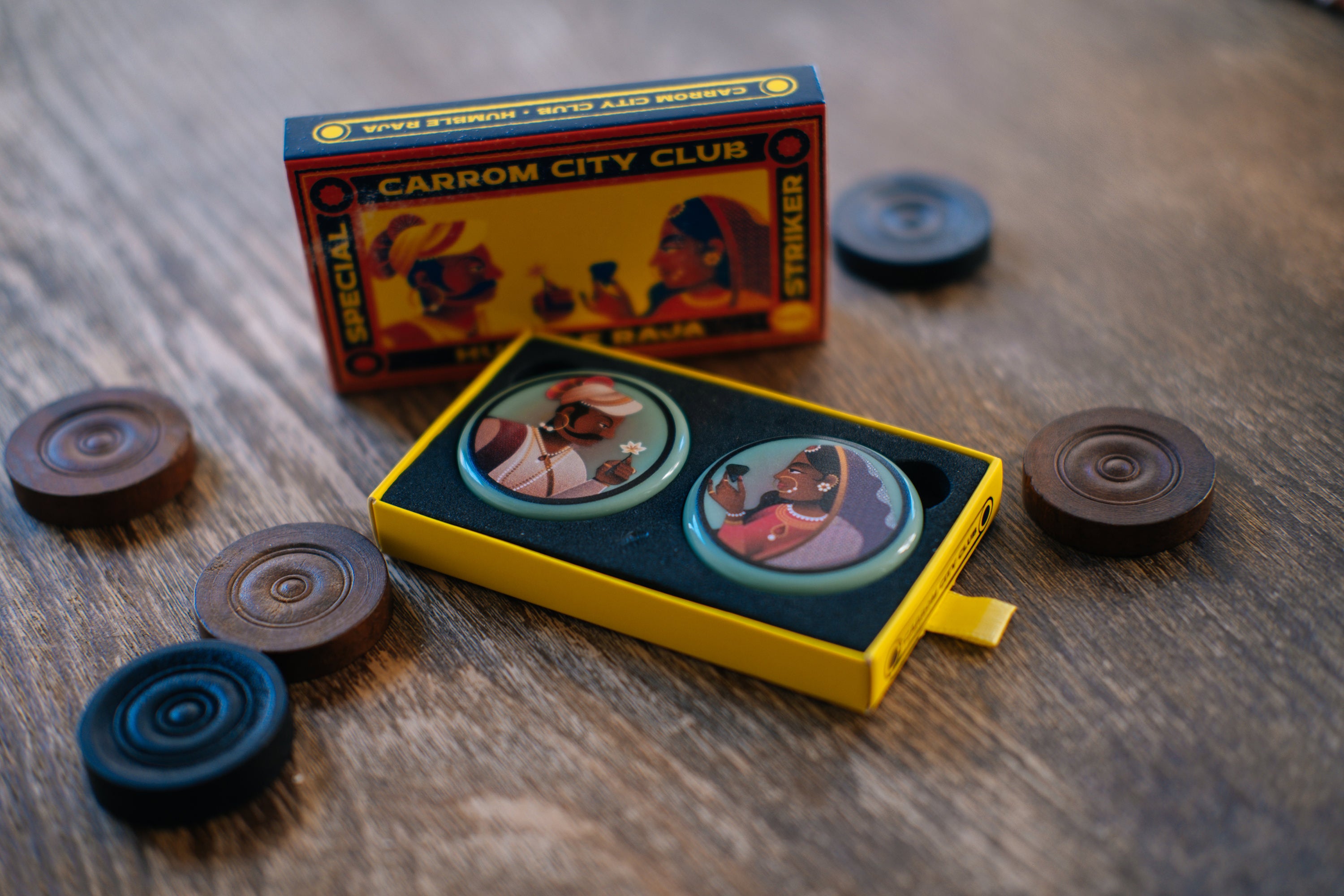 The Raja and Rani carrom strikers are designed by Humble Raja (Bhavesh and Reena Mistry). Inspired by miniature paintings of royalty, this king and queen face one another as equals.
